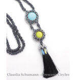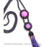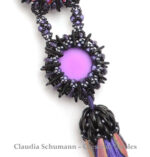 Benötigte Materialien: 11/0 Saatperlen, 15/0 Saatperlen, Crescent, feuerpolierte Glasschliffperlen 3mm, Doppelkegel 3mm, Dagger 5x16mm, Lunasoft Cabochons (je 2x) 24mm und 18mm, Quaste